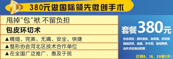 大连开发区男科医院特推出包皮环切术套餐享优惠活动,在8号、9号、10号凡来我院进行包皮环切术的患者朋友只需380元还可同时享受包含男科体检、血常规、尿常规、凝血四项、血糖、手术费、留观费、当天术后消炎费在内(每项体检费用仅需3.8元,为您把疾病一查到底)的套餐服务。