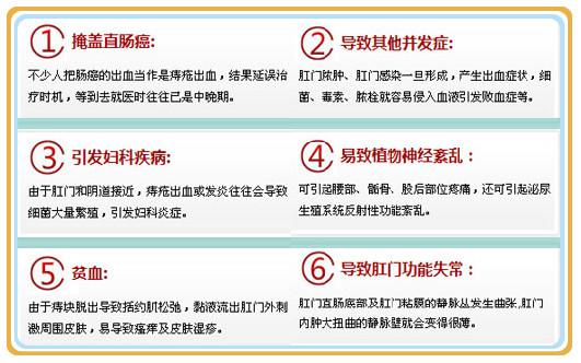 (3)痔疮便血和便秘的恶性循环,使人厌食,造成脾胃功能的失常,导致肛裂慢性结肠炎肛瘘肠癌等发生。